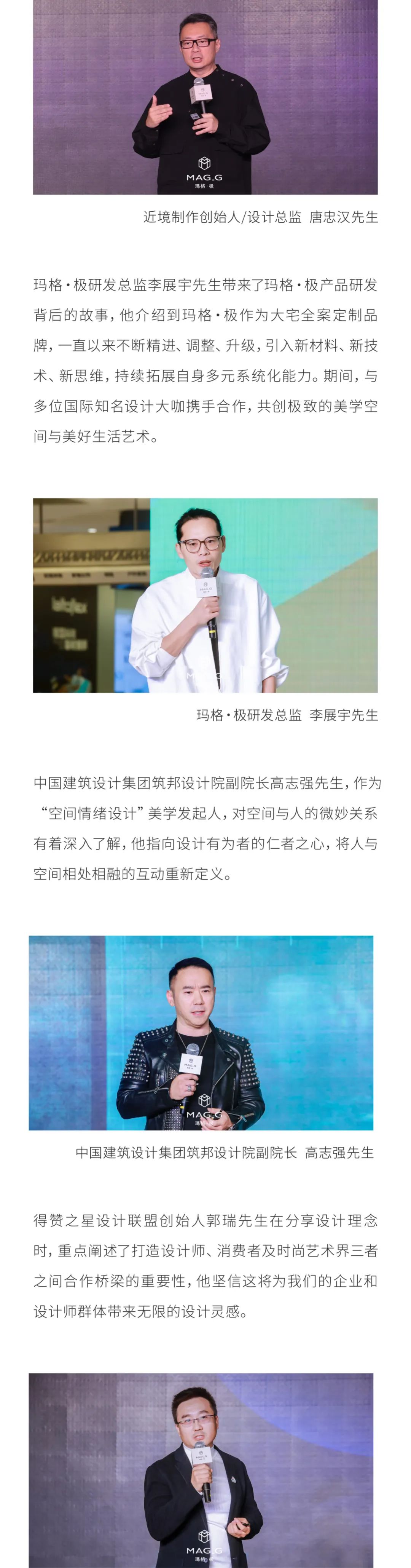 極物設(shè)計(jì)創(chuàng)始人/瑪格·極G系列聯(lián)名設(shè)計(jì)師姚君先生,在講述與瑪格·極合作過(guò)程中,瑪格·極誕生即謀定遠(yuǎn)見(jiàn),以設(shè)計(jì)為名共探極致造物精神,全面賦能設(shè)計(jì)師的創(chuàng)意設(shè)計(jì)落地,與瑪格·極合作中,瑪格·極大宅全案定制交付力,給到了我們150%的驚喜!其不單單是追求美學(xué)和工藝技術(shù),更多還有個(gè)性化定制,藝術(shù)與科技多元融合,將不止美好的極致生活藝術(shù)融入空間。